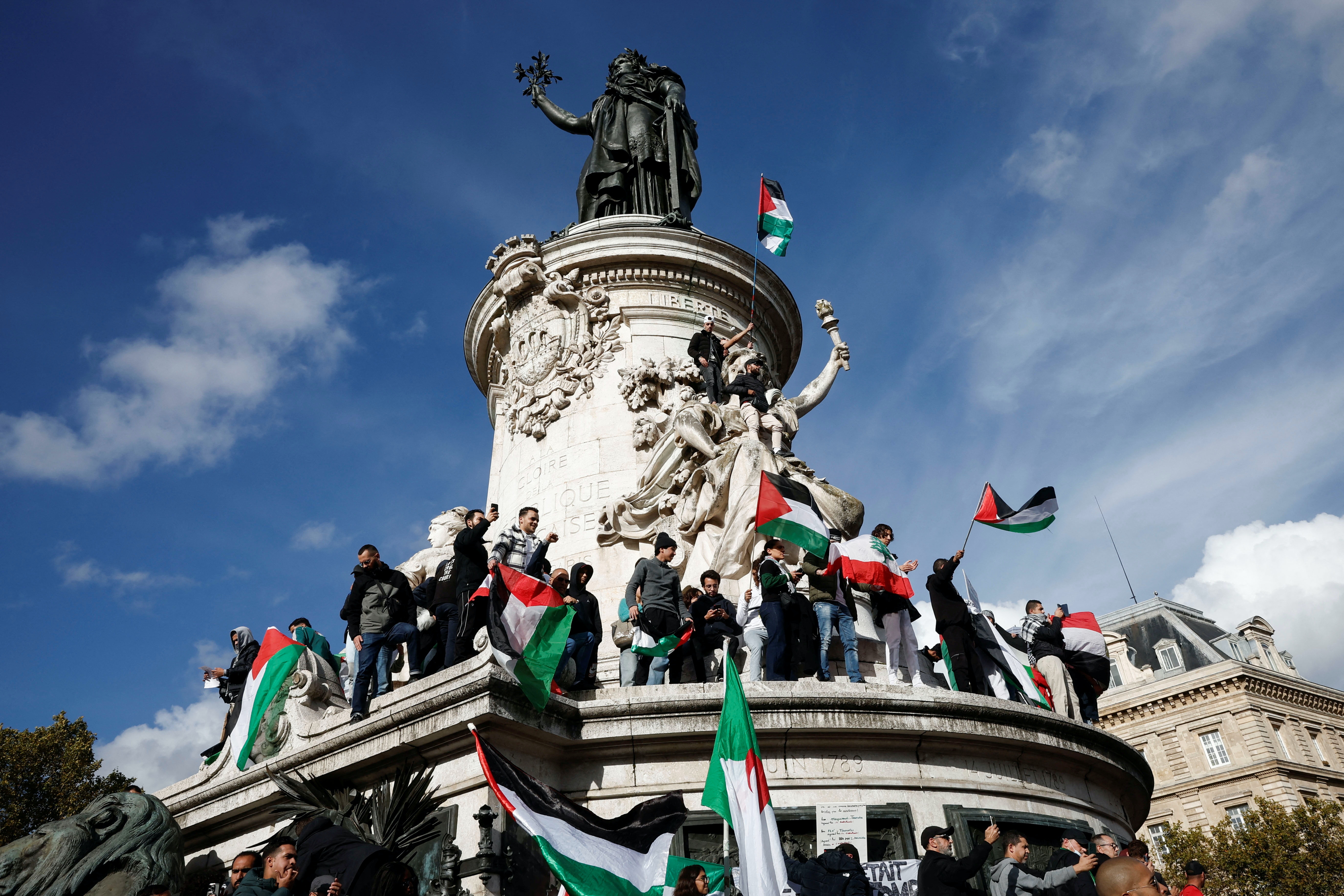 歐洲多國周日繼續有集會,分別支持以色列及巴勒斯坦。其中,自以巴爆發新一輪衝突以來,法國警方首度批准親巴勒斯坦群眾,10月22日在首都巴黎示威。根據警方統計,約15,000人聚集在共和廣場( Place de la Republique)聲援加沙。